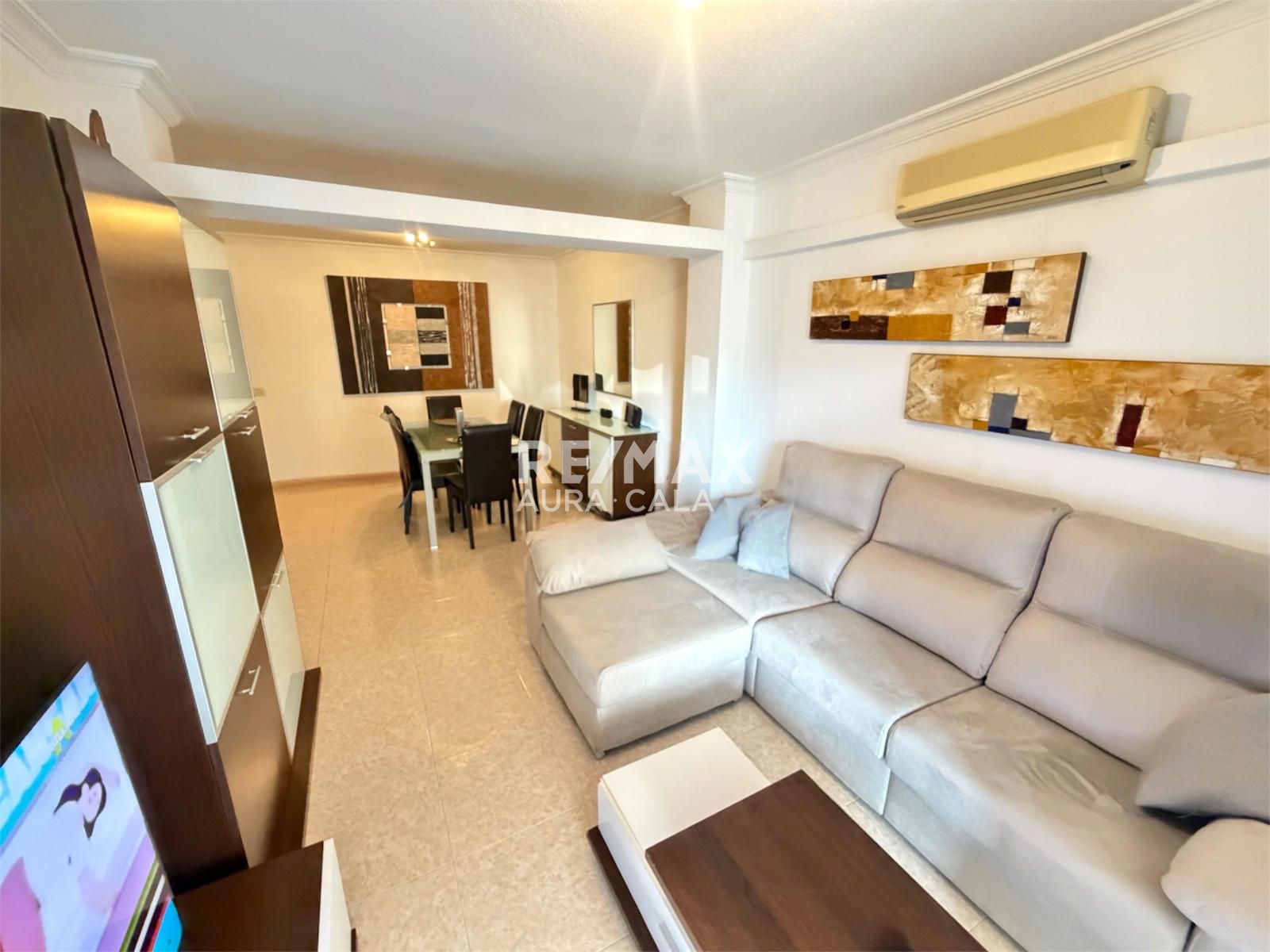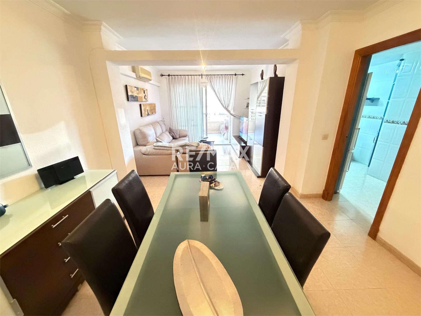 The property, situated on the first floor with lift access, stands out for its bright living-dining room with direct access to the balcony. It features a spacious fitted kitchen with a practical separate utility room. It comprises three bedrooms and two bathrooms, offering a functional and well-balanced layout. Furthermore, it is equipped with a hot/cold air conditioning system to ensure comfort all year round and includes a garage space, a key added value in the area.