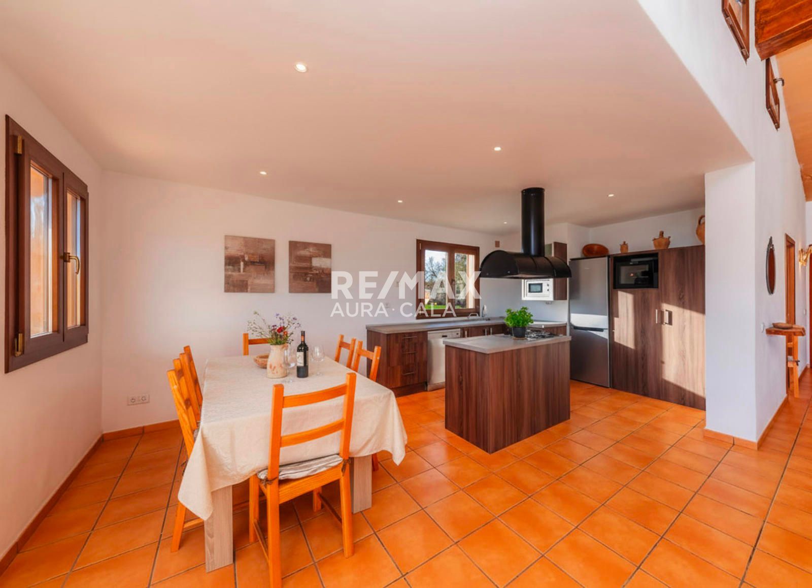 En el interior, la serenidad continúa: tres dormitorios dobles (uno con baño en suite), un salón acogedor con chimenea y una cocina completamente equipada. Cada espacio transmite equilibrio, con materiales naturales, suelos de terracota y detalles que reflejan el espíritu de la isla.