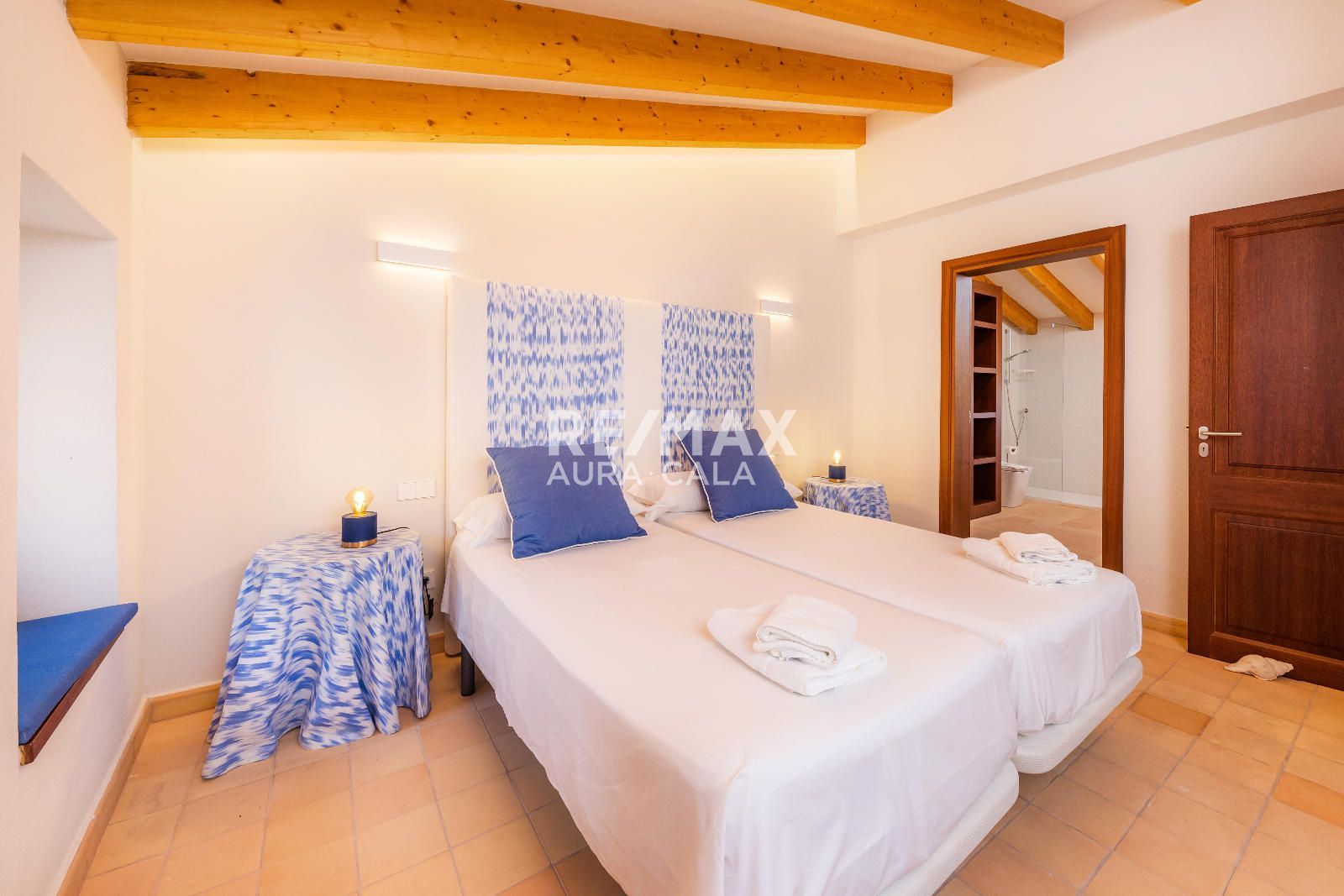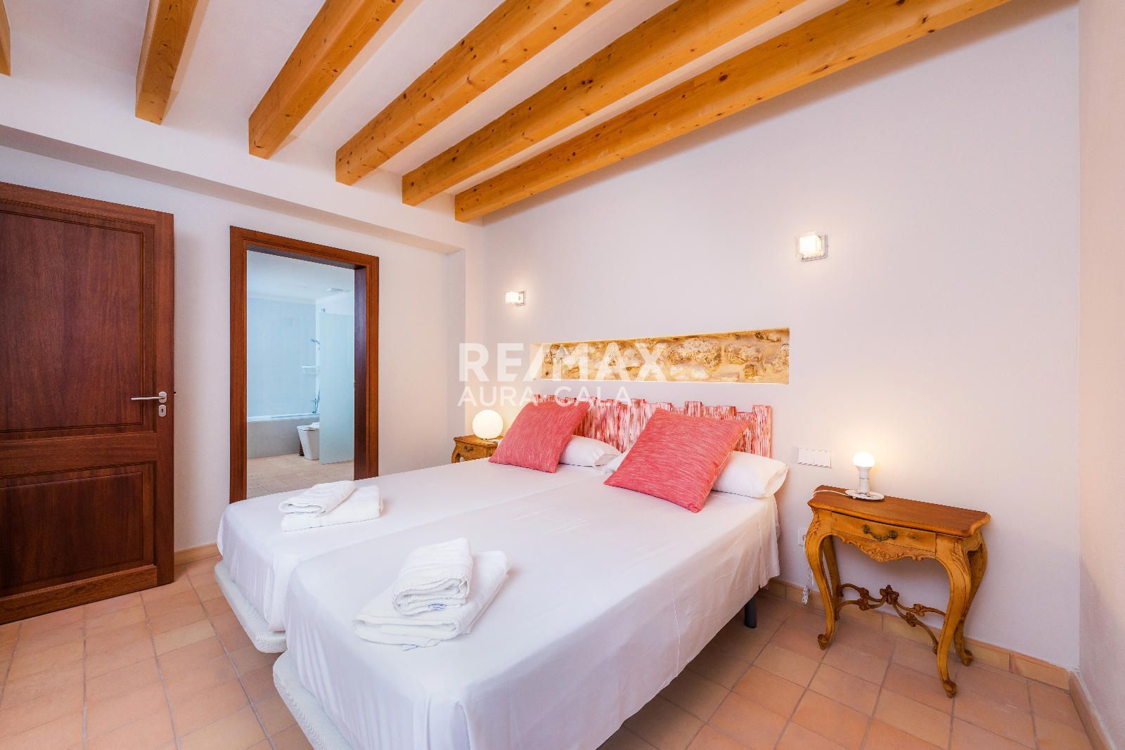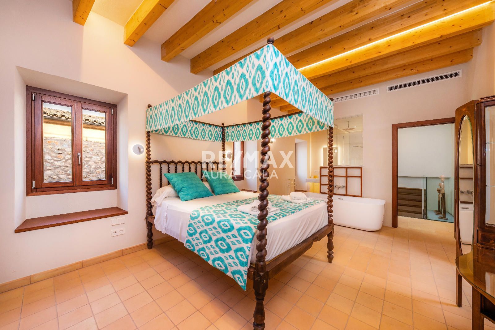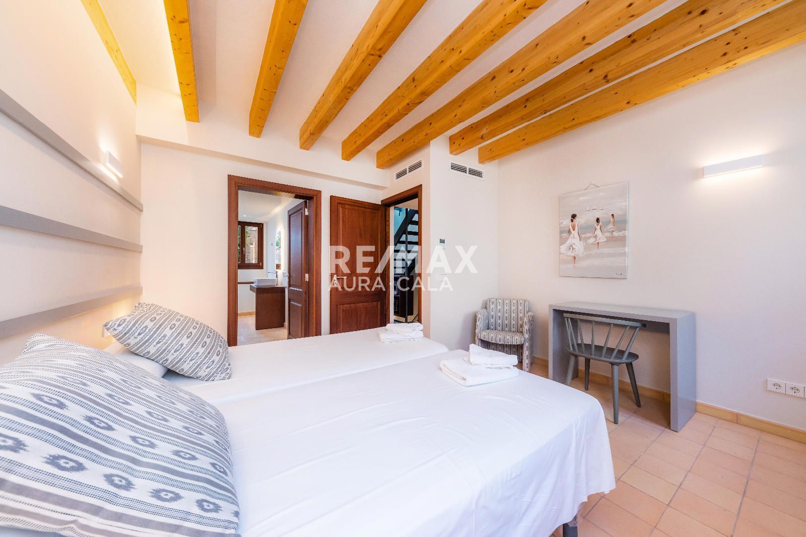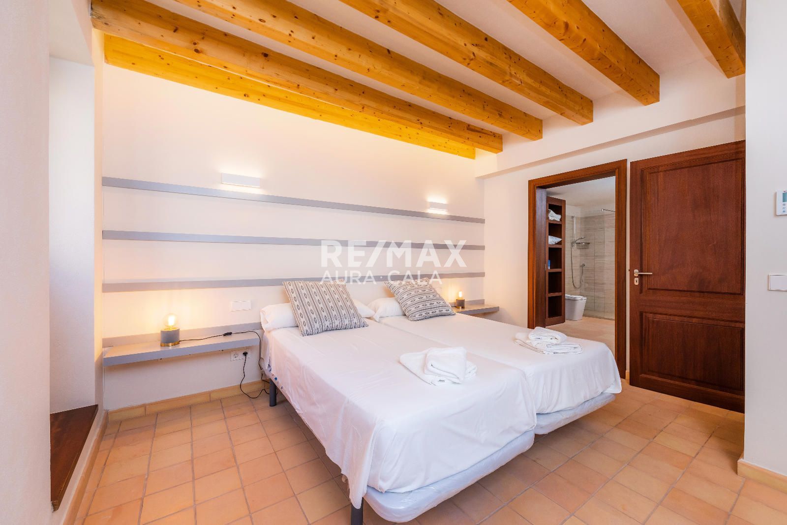 Subiendo las escaleras, en un nivel intermedio, encontramos el dormitorio principal con baño en suite, con una bonita bañera y también ducha. En el primer piso tenemos dos dormitorios dobles con baño en suite, uno con bañera y el otro con ducha. En la segunda planta tenemos la misma distribución que en la primera planta con dos dormitorios y dos baños en suite y además acceso a una terraza con vistas sobre el pueblo de Artà.