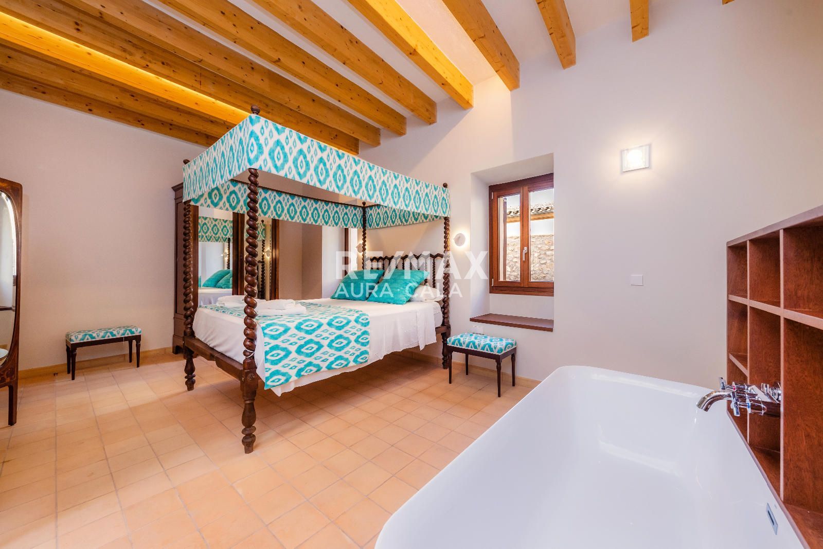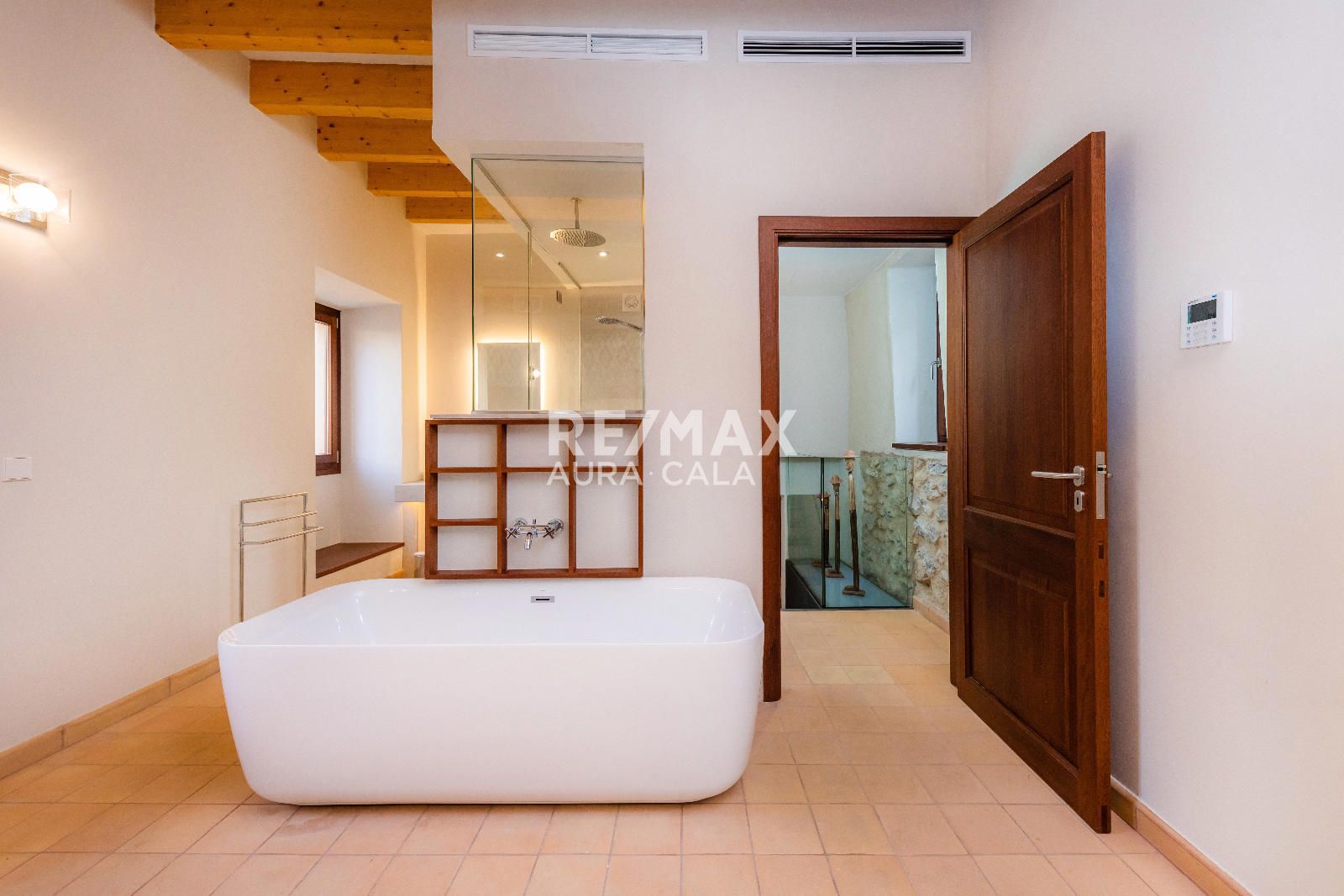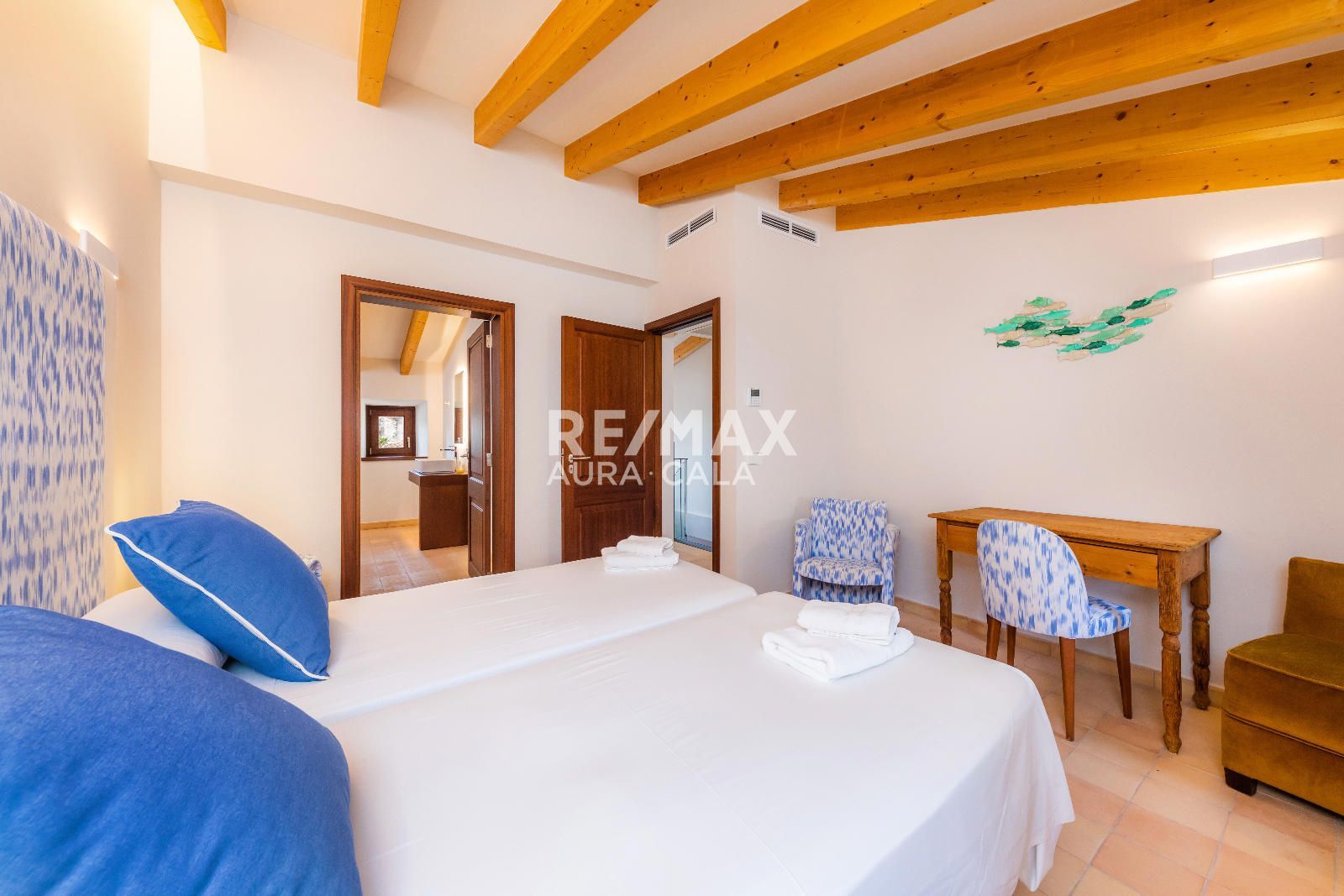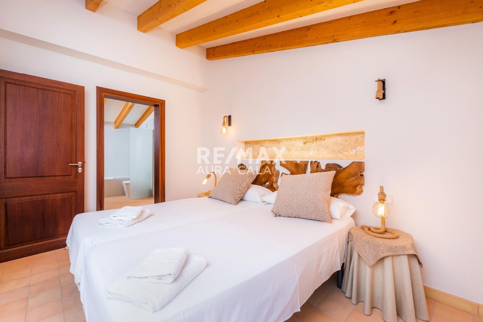 Subiendo las escaleras, en un nivel intermedio, encontramos el dormitorio principal con baño en suite, con una bonita bañera y también ducha. En el primer piso tenemos dos dormitorios dobles con baño en suite, uno con bañera y el otro con ducha. En la segunda planta tenemos la misma distribución que en la primera planta con dos dormitorios y dos baños en suite y además acceso a una terraza con vistas sobre el pueblo de Artà.