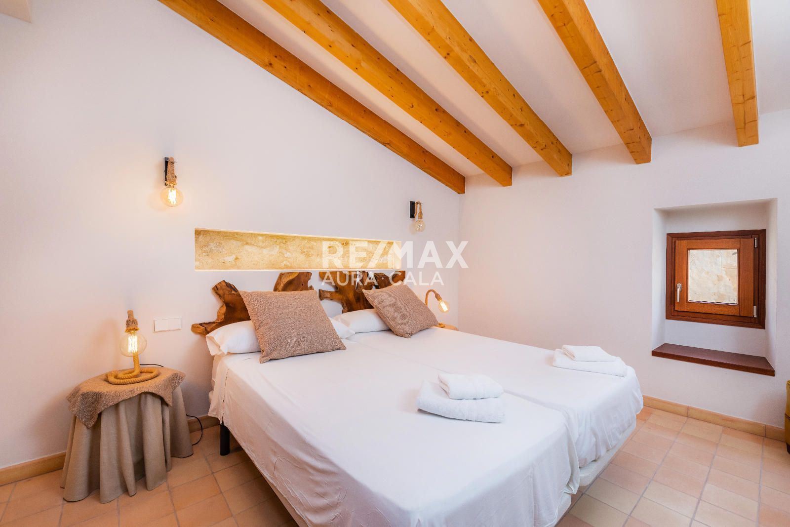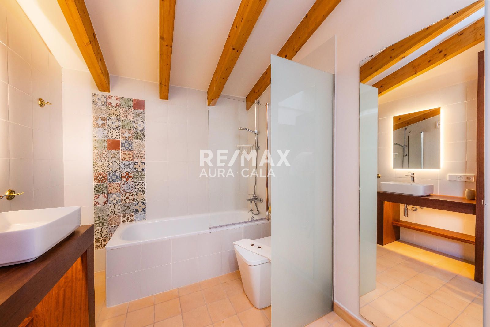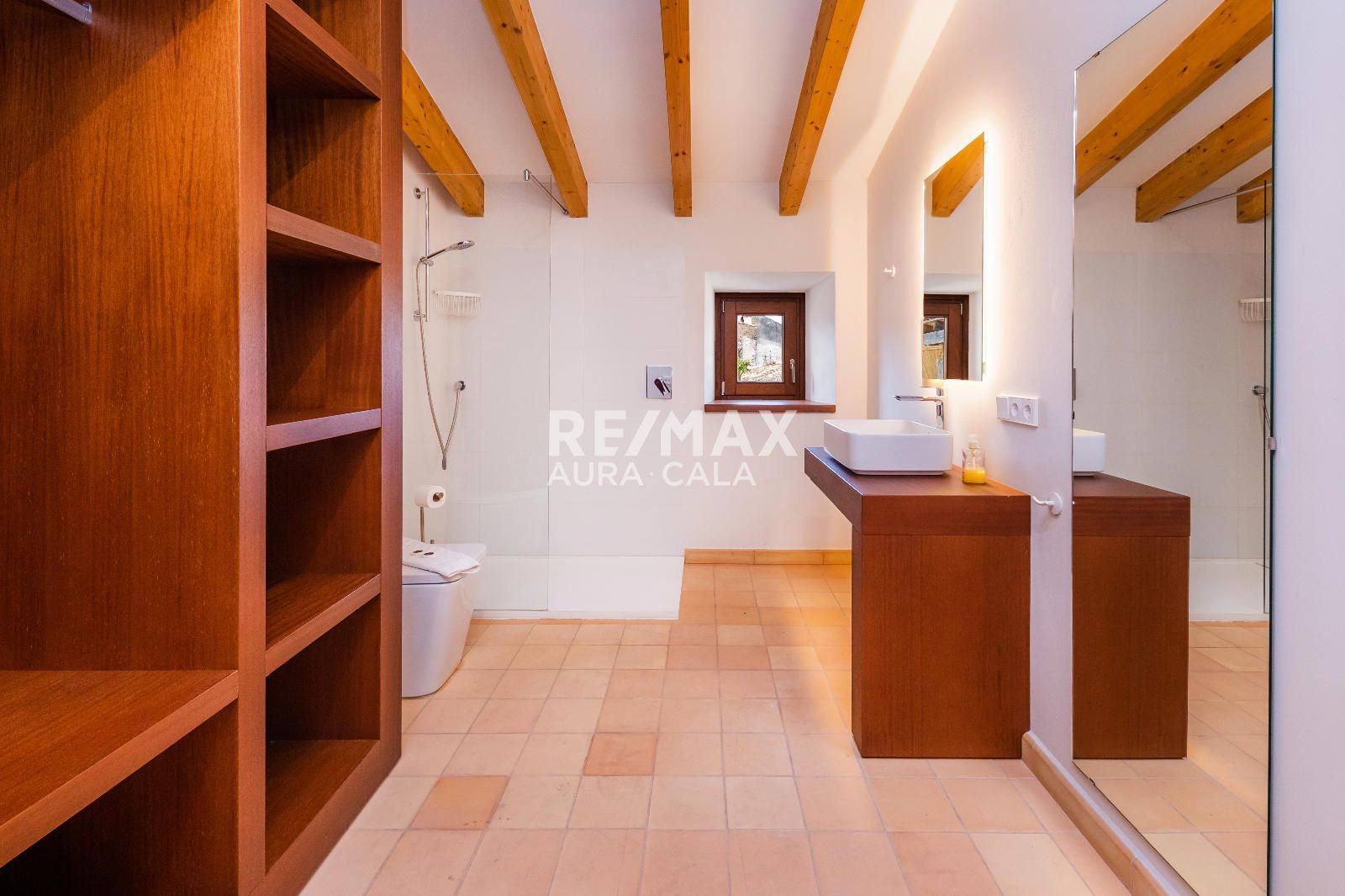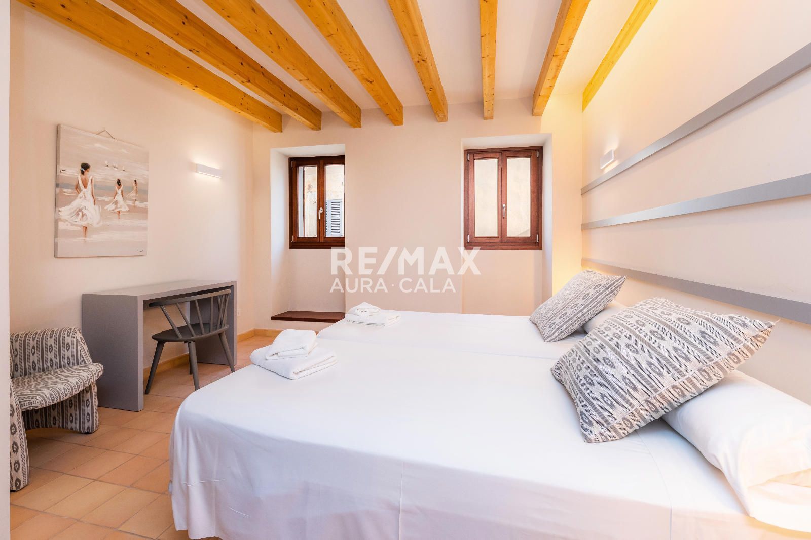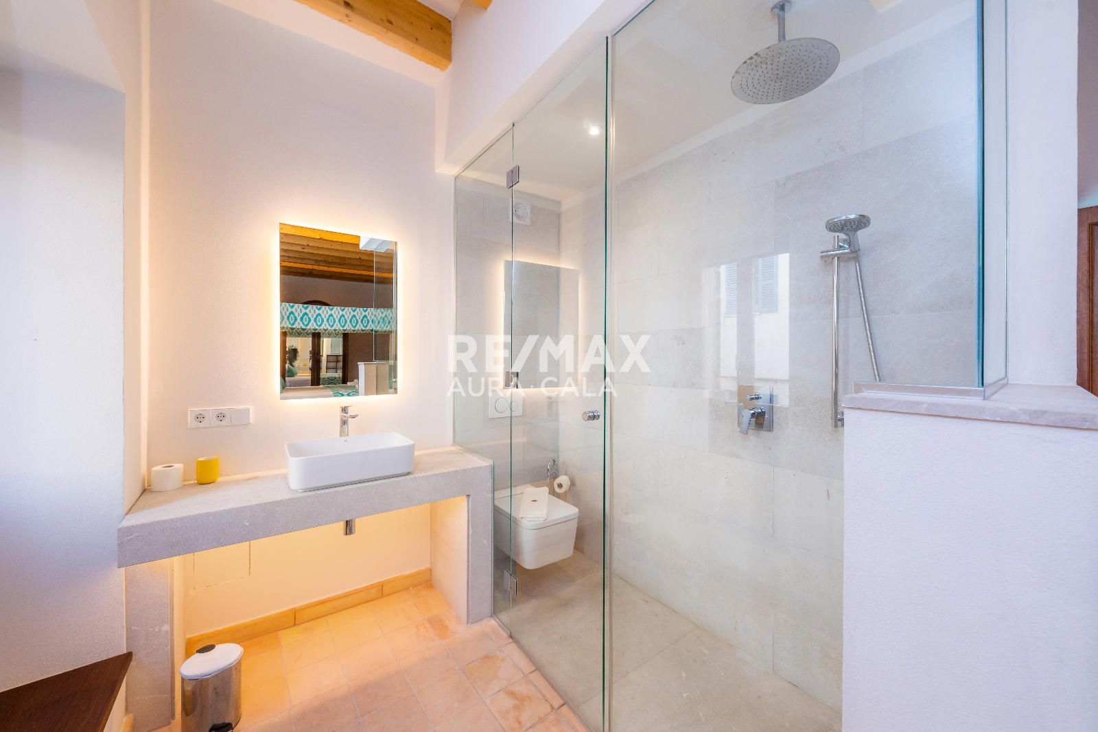 Subiendo las escaleras, en un nivel intermedio, encontramos el dormitorio principal con baño en suite, con una bonita bañera y también ducha. En el primer piso tenemos dos dormitorios dobles con baño en suite, uno con bañera y el otro con ducha. En la segunda planta tenemos la misma distribución que en la primera planta con dos dormitorios y dos baños en suite y además acceso a una terraza con vistas sobre el pueblo de Artà.