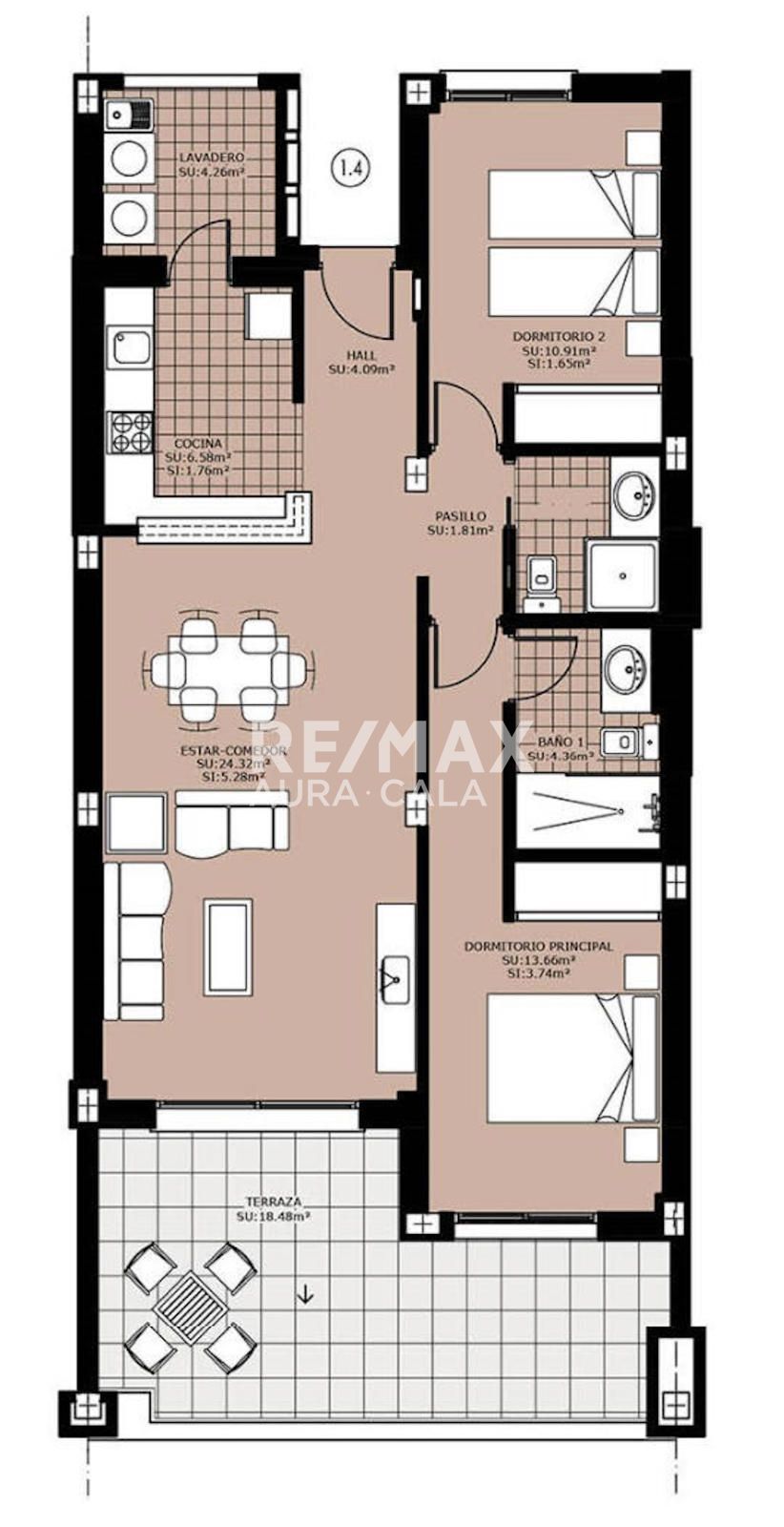 Ref.: 2009 Ejemplo de apartamento 1-1-4 1ª planta: Superficie habitable 85,82 m² / Terraza 20,30 m² / Superficie total: 106,12 m² / Plaza de garaje / Precio: 380.000 €