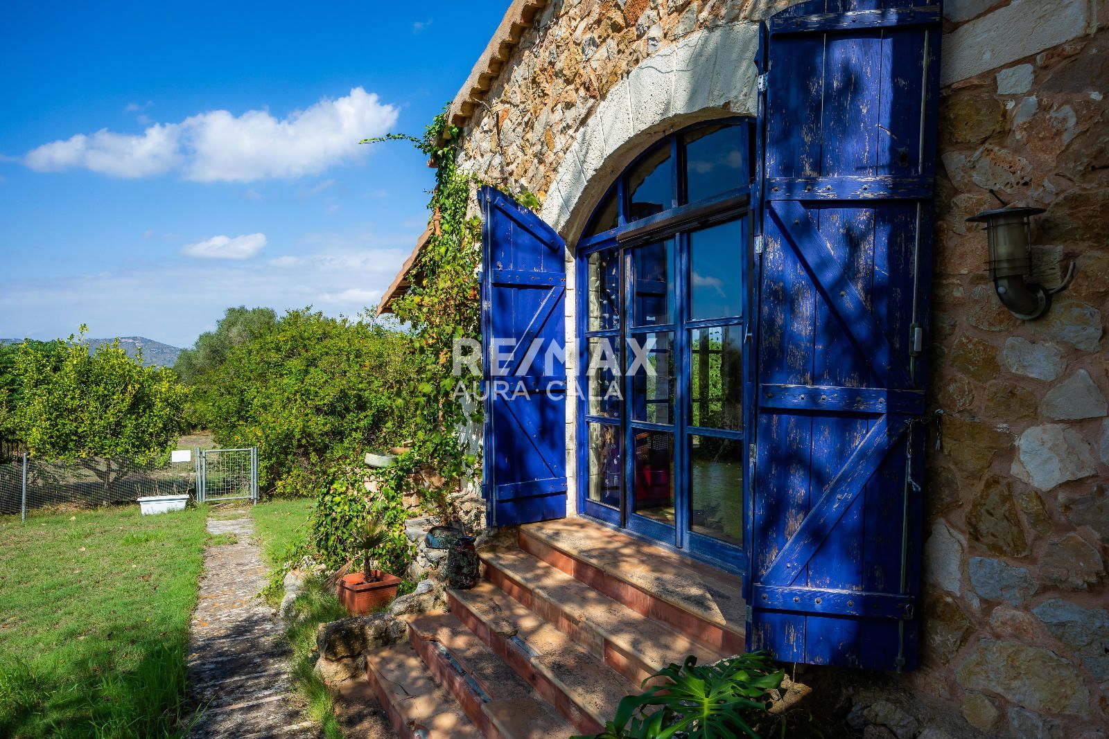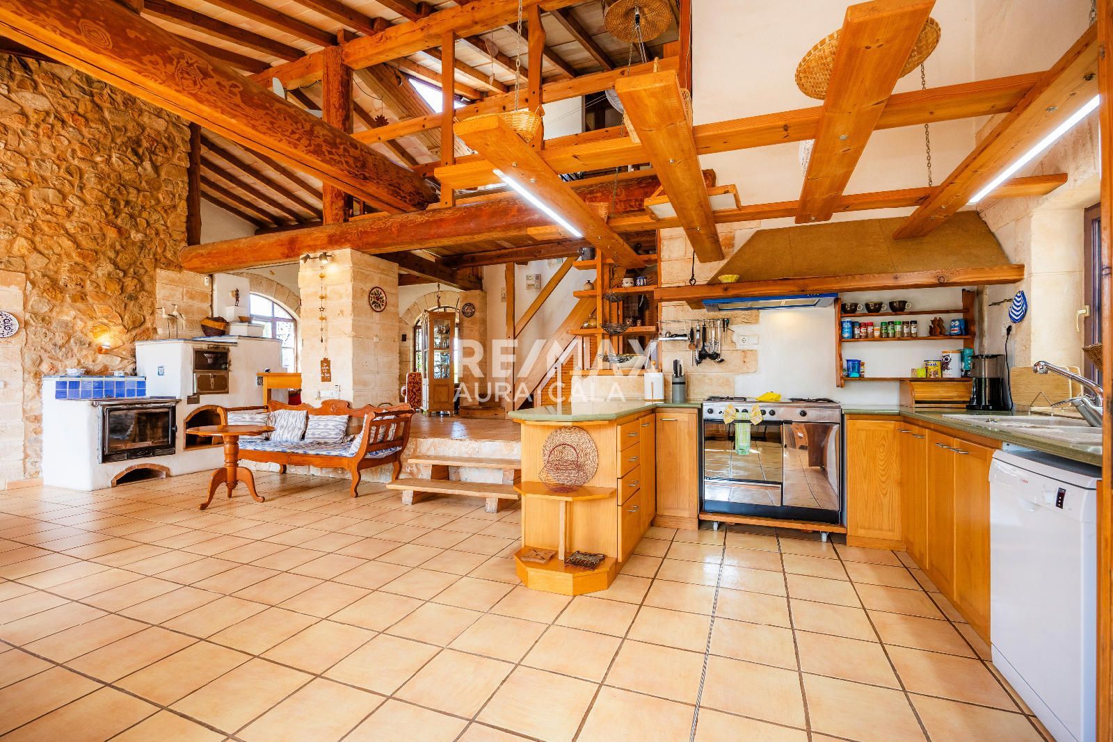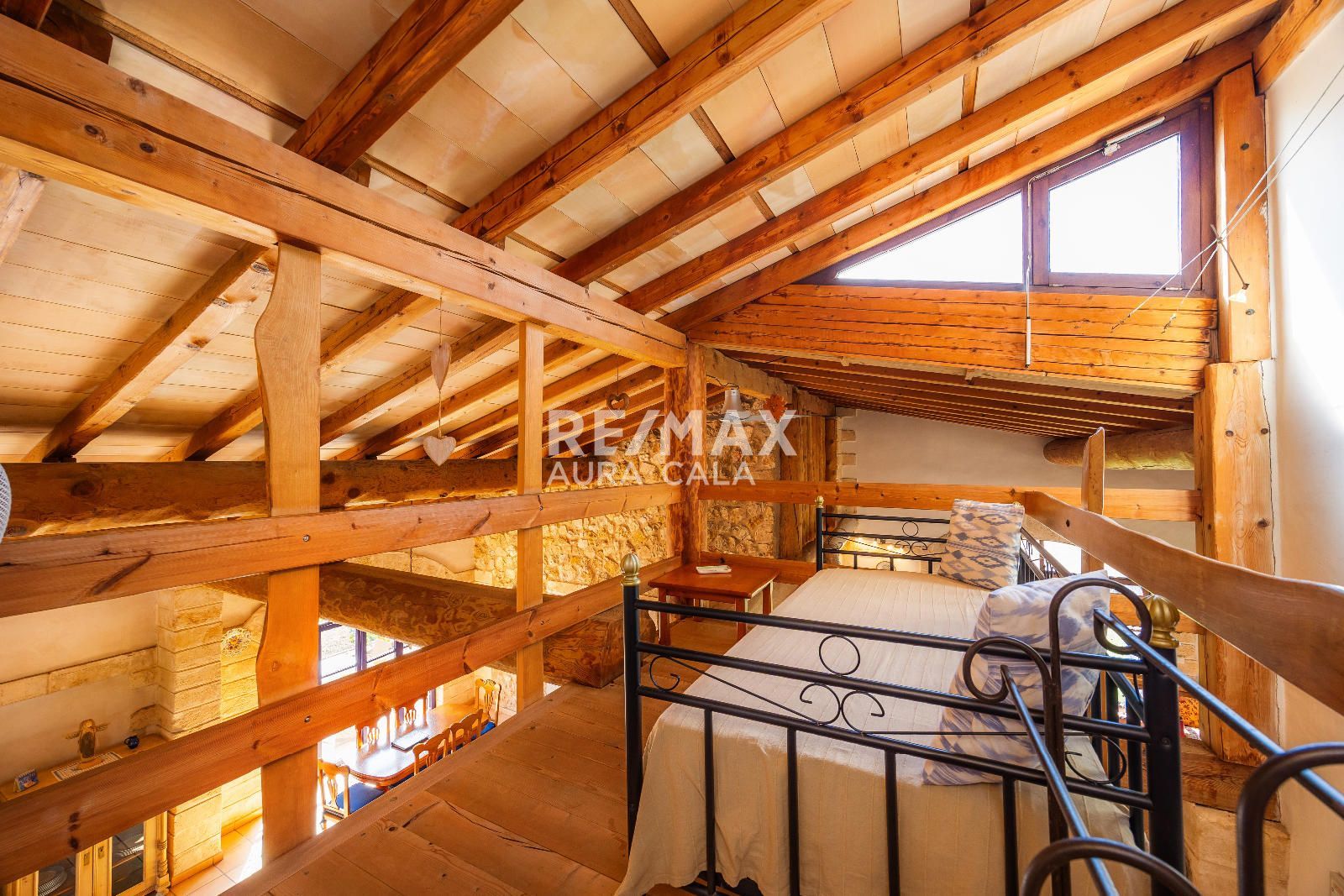 La propiedad se asienta sobre un extenso terreno de aproximadamente 15.000 m² y cuenta con una vivienda principal y una casita de invitados. Construida con un estilo rústico y auténtico, combina materiales nobles y detalles singulares: vigas de madera importadas de Austria, paredes de piedra natural y una estufa de leña con sistema de triple tiro que aporta un carácter inconfundible. Los espacios interiores destacan por su luminosidad y amplitud, con techos altos, ventanales que conectan directamente con el paisaje y terrazas orientadas al sur que permiten disfrutar de las vistas al mar. La habitación de la torre, con dormitorio y baño, ofrece un rincón íntimo con panorámicas que abarcan desde la costa hasta la Serra de Tramuntana.