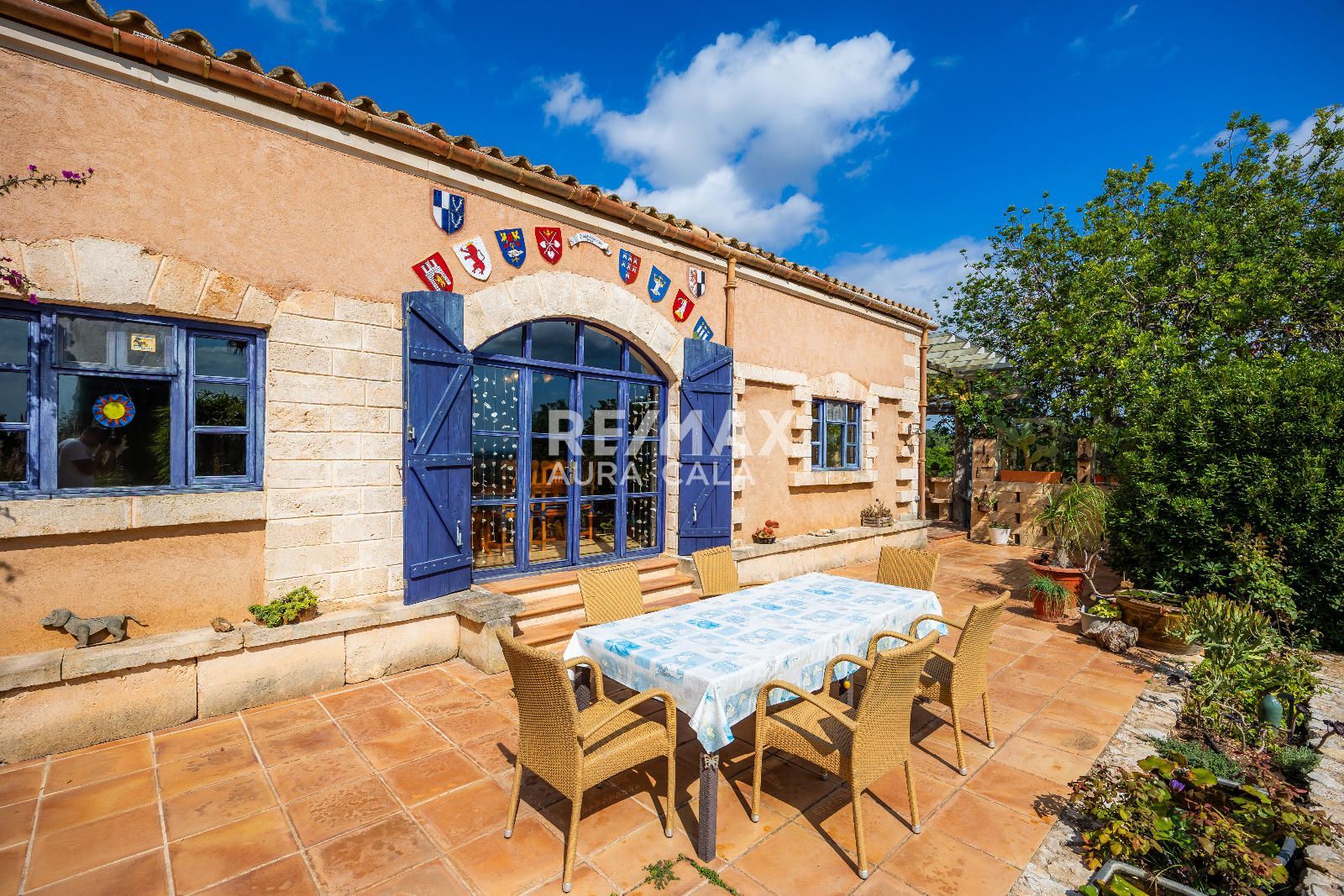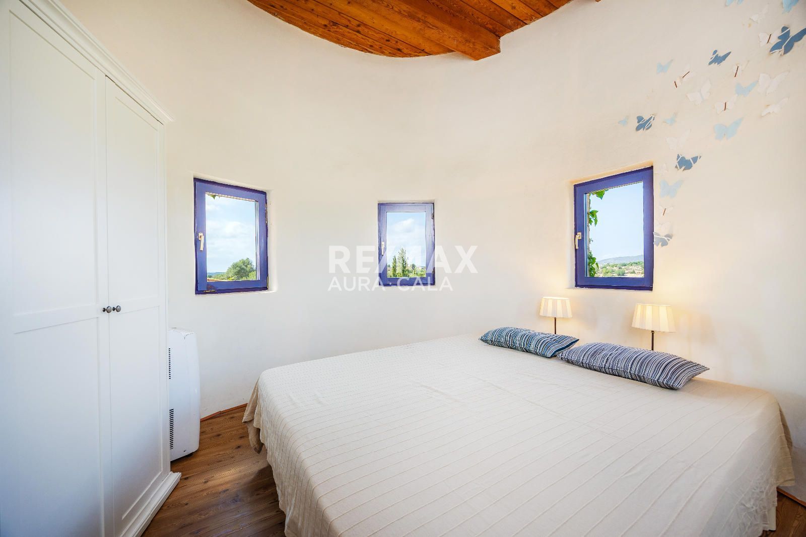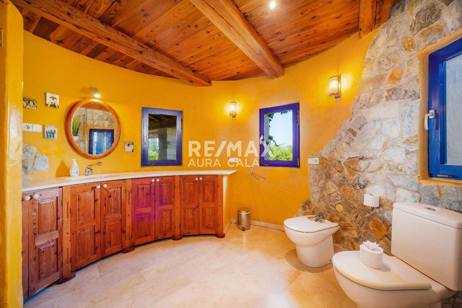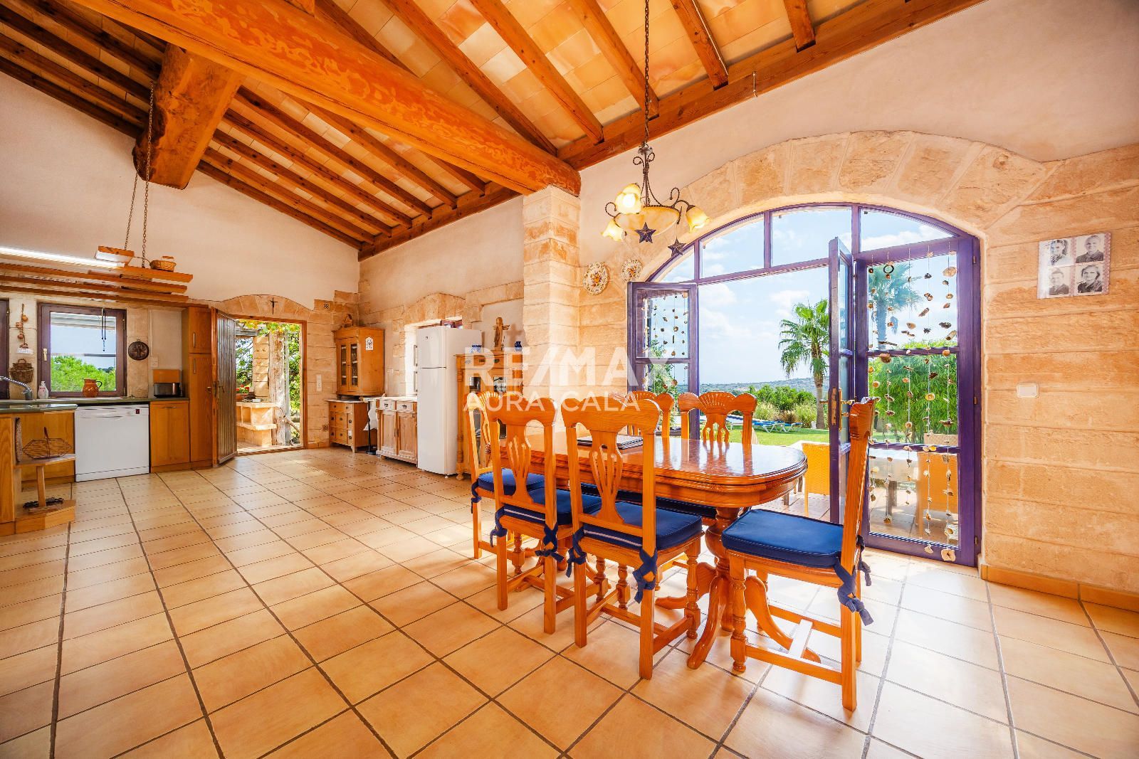 La propiedad se asienta sobre un extenso terreno de aproximadamente 15.000 m² y cuenta con una vivienda principal y una casita de invitados. Construida con un estilo rústico y auténtico, combina materiales nobles y detalles singulares: vigas de madera importadas de Austria, paredes de piedra natural y una estufa de leña con sistema de triple tiro que aporta un carácter inconfundible. Los espacios interiores destacan por su luminosidad y amplitud, con techos altos, ventanales que conectan directamente con el paisaje y terrazas orientadas al sur que permiten disfrutar de las vistas al mar. La habitación de la torre, con dormitorio y baño, ofrece un rincón íntimo con panorámicas que abarcan desde la costa hasta la Serra de Tramuntana.